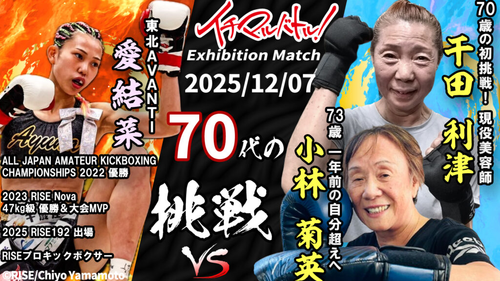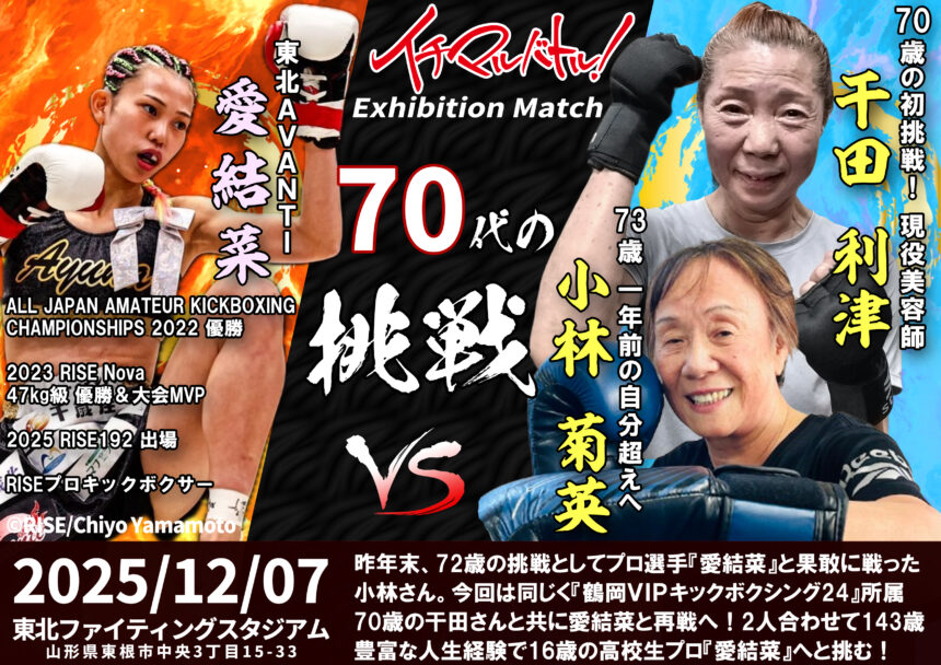 2024年12月8日『イチマルバトル!最終戦』にて行われた小林 菊英さん(鶴岡VIPキックボクシングスポーツ24所属)の「72歳でキックボクシングの試合に出場する」という熱意にて実現した『72歳の挑戦!!』