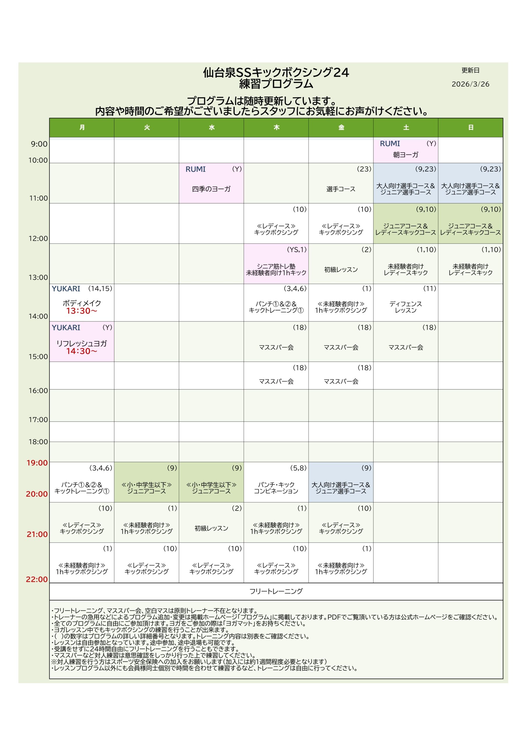 プログラム変更時はこちらでお知らせいたします。(ヨガはこちら)