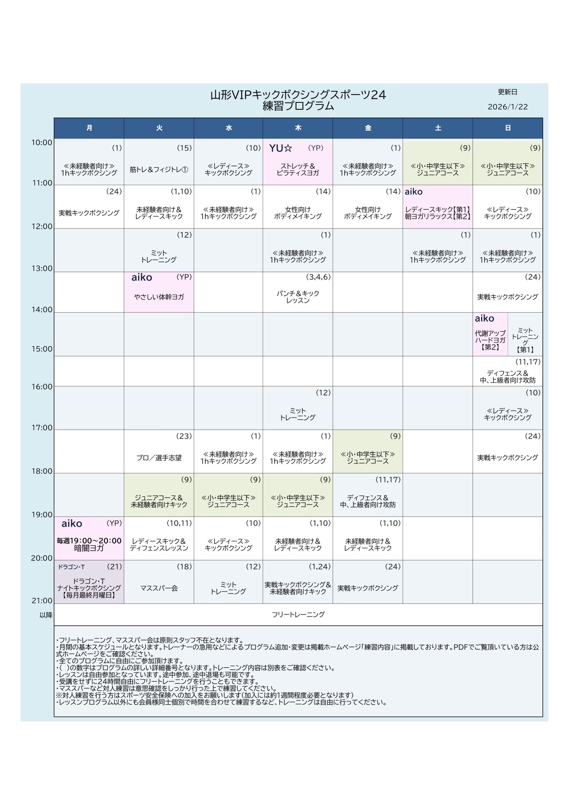 • 1月26日(月) 21:00のナイトキックボクシングは 『 うっちーナイトキックボクシング 』 となり、担当が内山へ変更となります。(男性の方も参加可能です。)